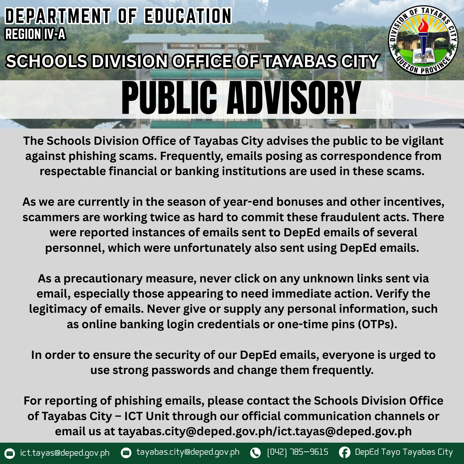 The Schools Division Office of Tayabas City advises the public to be vigilant against phishing scams. Frequently, emails posing as correspondence from respectable financial or banking institutions are used in these scams.