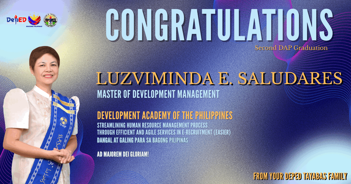 Saludares of SDO Tayabas City Conferred a Masteral Degree at PICC Dr. Luzviminda E. Saludares of SDO Tayabas City was formally conferred the degree Master of Development Management by the Development Academy of the Philippines during the 2nd One DAP Graduation Ceremony held at the Philippine Intern...